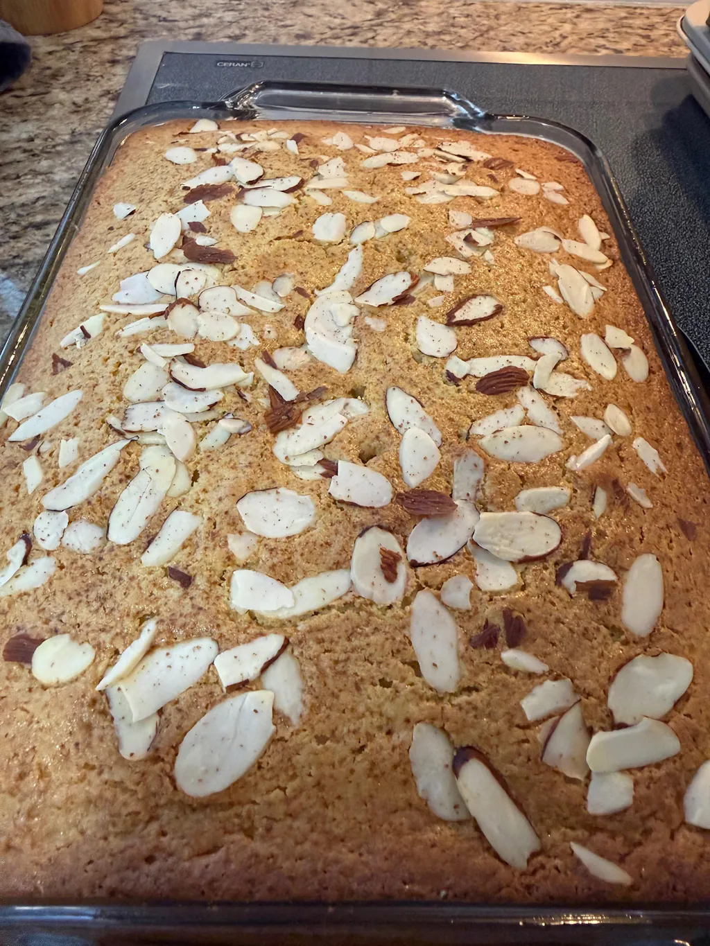 - Scrape batter into prepared pan(s) and evenly sprinkle with toppings (e.g., sliced almonds).