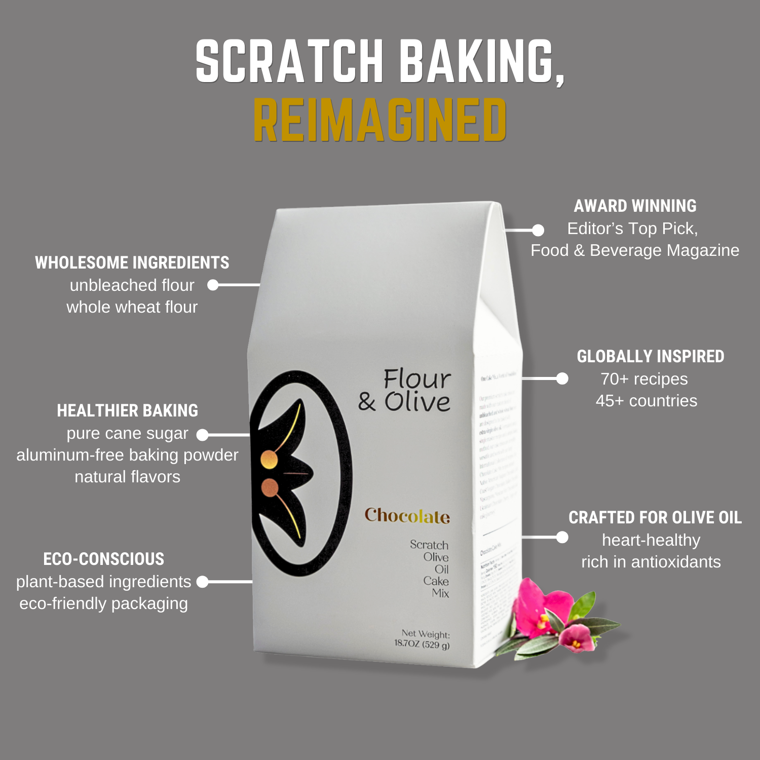 Designed for extra virgin olive oil and simple baking, our plant-based cake mixes deliver a light, airy crumb with a refined approachable olive oil flavor and subtle fruity notes that let the cake's essence shine. Each mix connect to our unique, interactive Cake Map with 70+ global recipes, including vegan and dairy-free options.