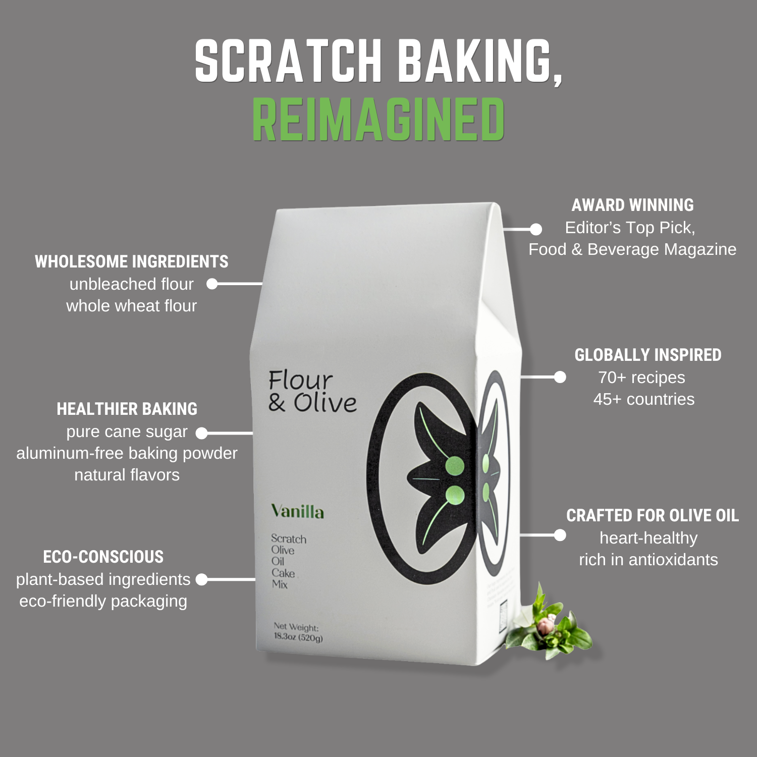 Designed for extra virgin olive oil and simple baking, our plant-based cake mixes deliver a light, airy crumb with a refined approachable olive oil flavor and subtle fruity notes that let the cake's essence shine. Each mix connect to our unique, interactive Cake Map with 70+ global recipes.